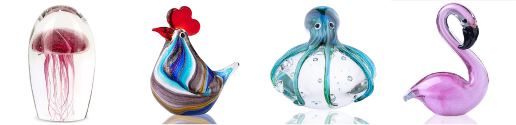Soft Glass Figurines: it is also called Blown glass figurine, that is made from soft glass and all hand made as well. When making a soft glass figurine, there are more colors that can be chosen, but more difficult to work with. The glass blowers use a blowpipe to make a bubble in the heated glass, then use various tools with different shape, such as circular and flat, etc, to help to create a beautiful work of art. The glass is controlled by air from the blowpipe and tools by blowers, and added colors slowly. When soft glass figurines are finished, it must cool down very very slowly with a gradual temperature drop, otherwise, it will explode.